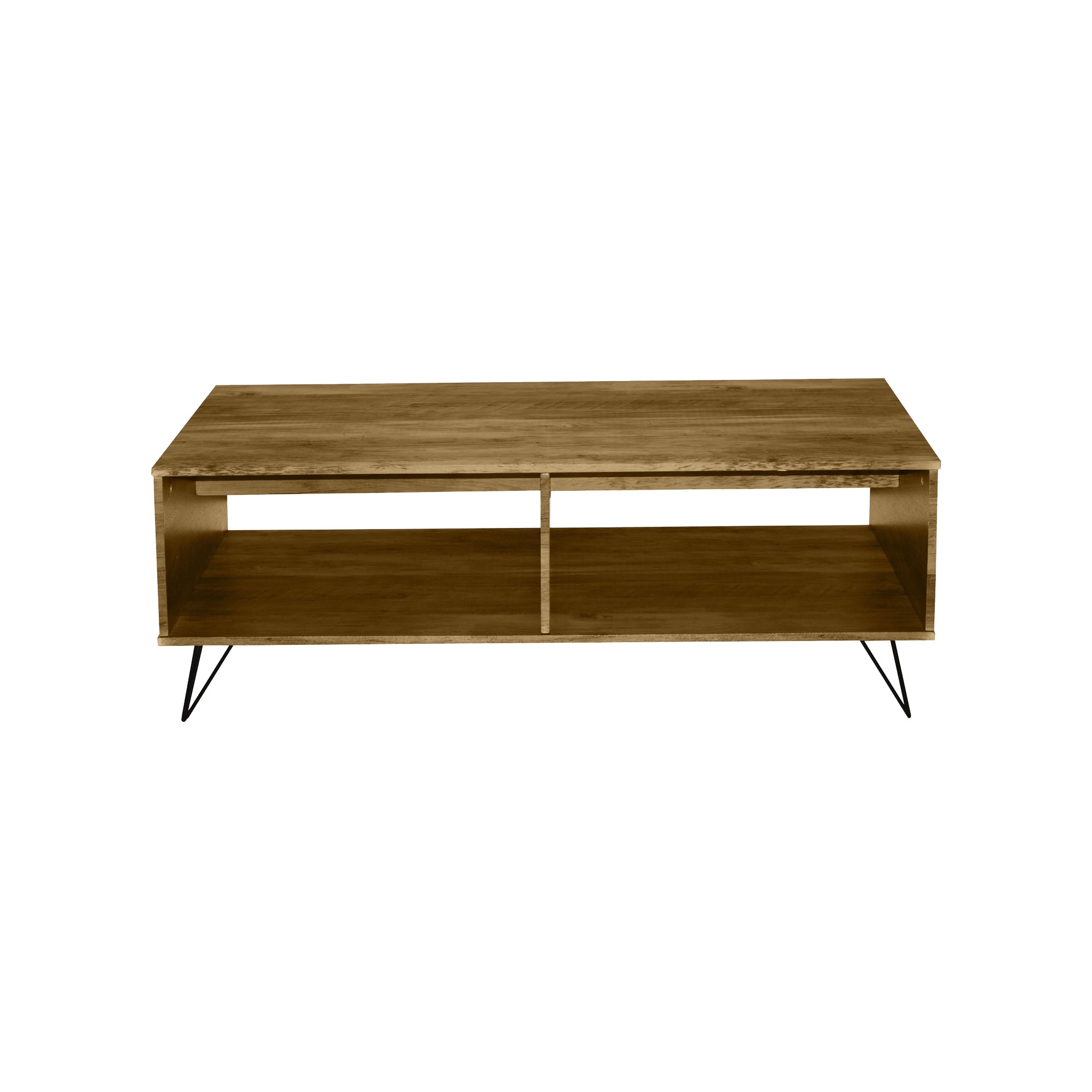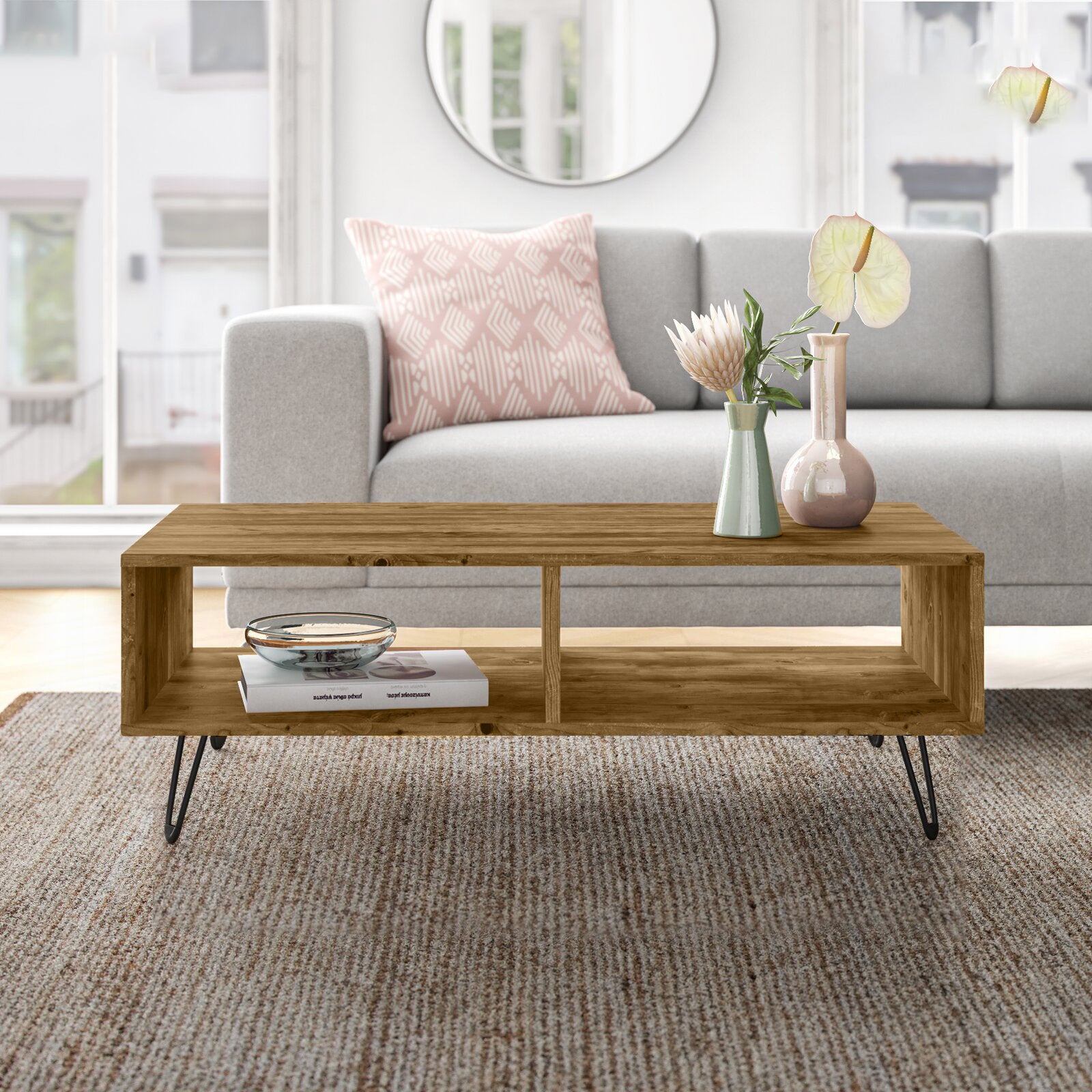 The Charlize Center Table exudes natural warmth and modern simplicity. Designed with an open-shelf layout, it offers both functionality and visual lightness — perfect for displaying books, décor, or everyday essentials. Supported by sleek black metal hairpin legs, this piece adds a stylish mid-century touch to your living room.