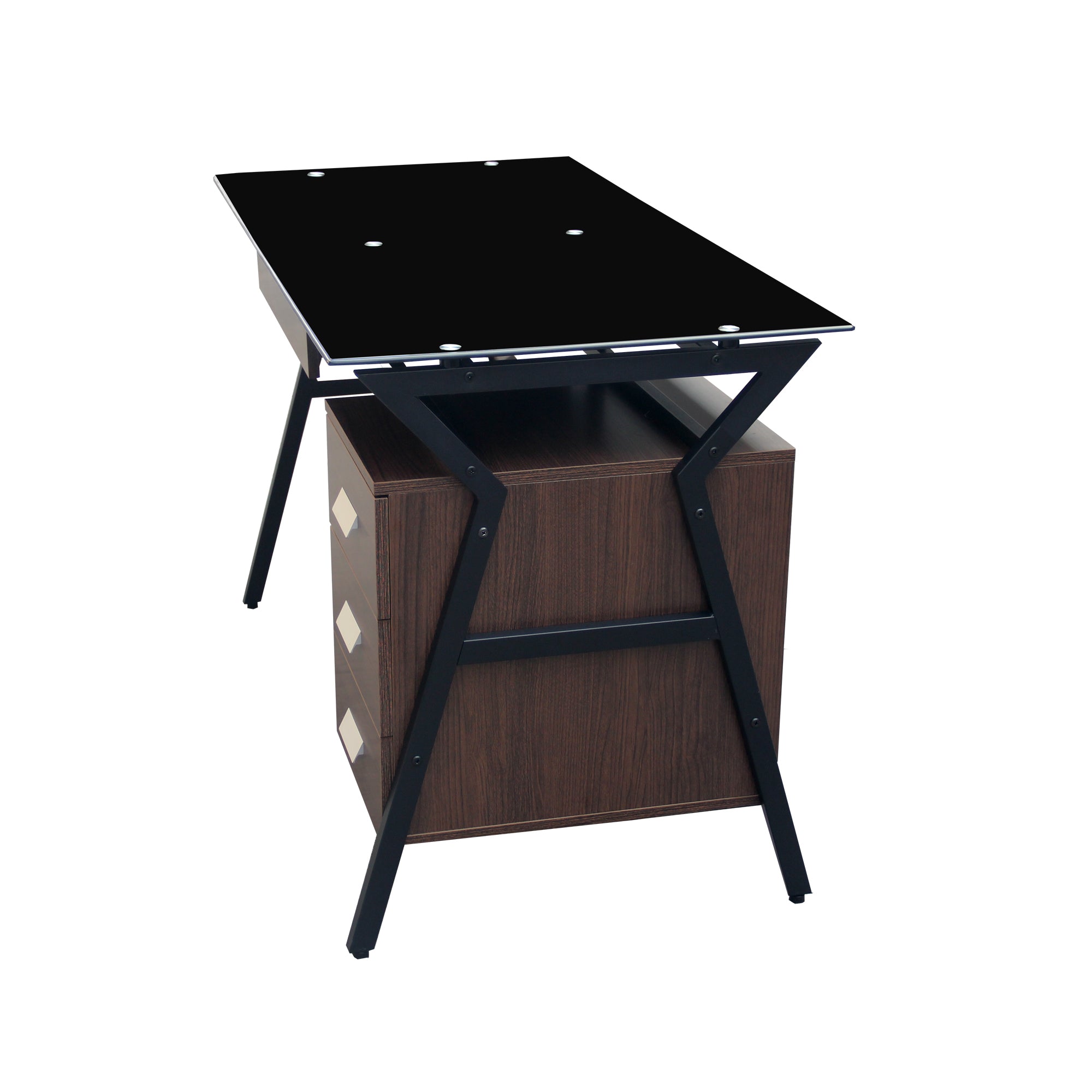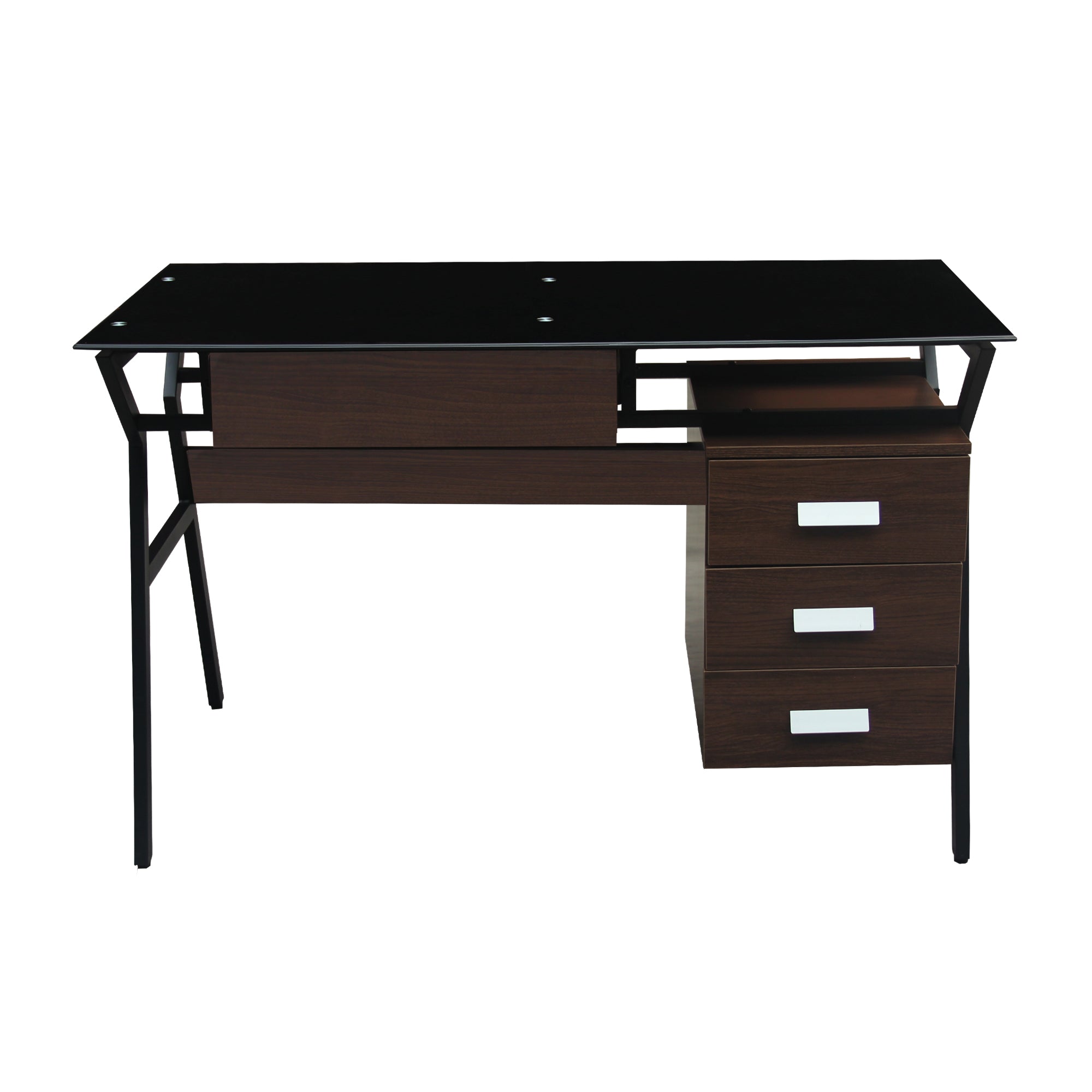 The Roma Office Table brings sophistication and strength together in one modern design. Its sleek black tempered glass top gives a refined and professional look, while the walnut wood finish and matte black metal frame provide stability and style. With three spacious drawers, it offers ample storage for office essentials — keeping your workspace neat and productive.
