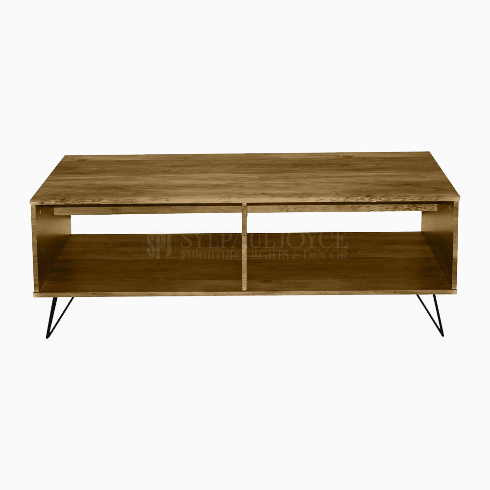 The Charlize Center Table exudes natural warmth and modern simplicity. Designed with an open-shelf layout, it offers both functionality and visual lightness — perfect for displaying books, décor, or everyday essentials. Supported by sleek black metal hairpin legs, this piece adds a stylish mid-century touch to your living room.