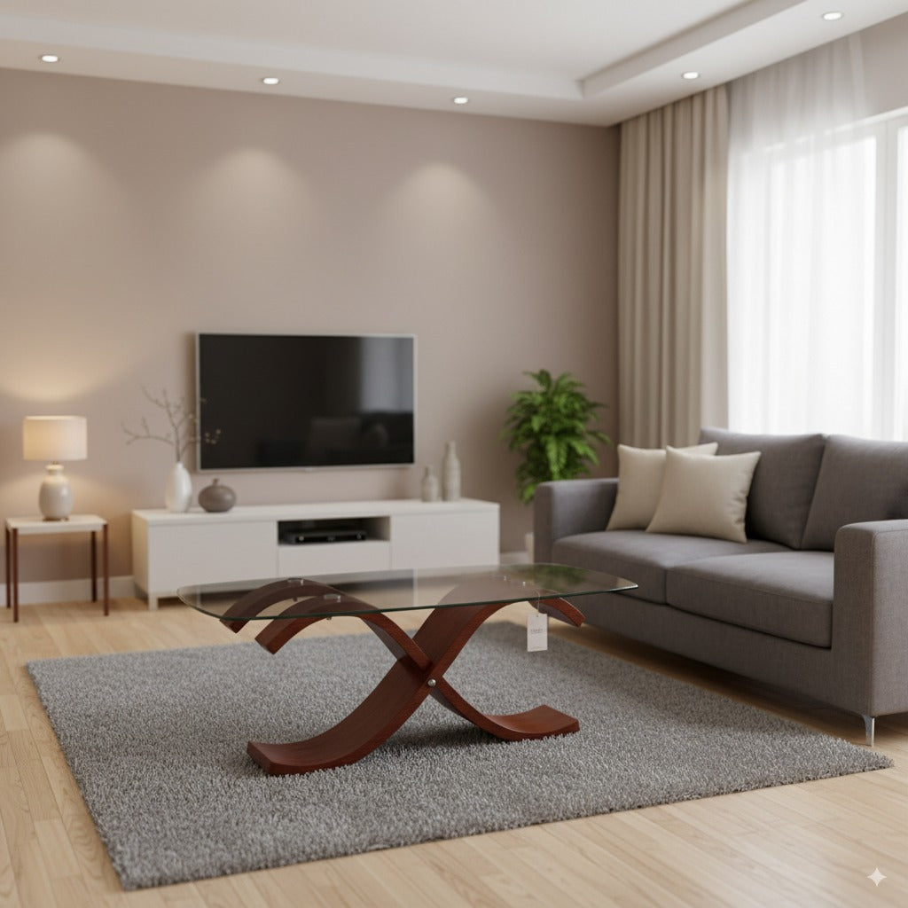 The Josh Center Table combines artistry and functionality with its sculptural wooden base and elegant glass top. Crafted from solid Asian wood in a rich walnut finish, its gracefully curved legs form an eye-catching “X” silhouette that adds sophistication to any living space. The tempered glass top enhances the airy, modern aesthetic while ensuring durability for everyday use.