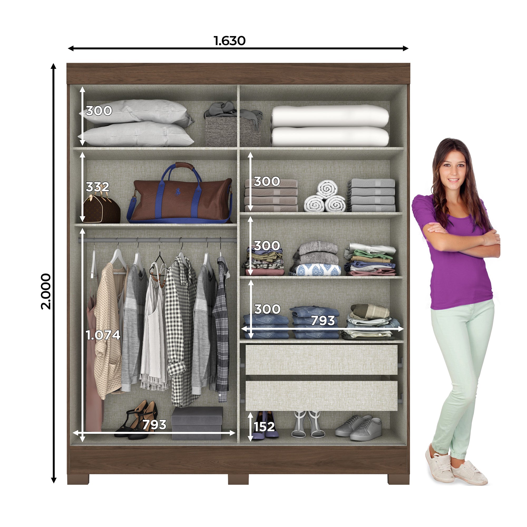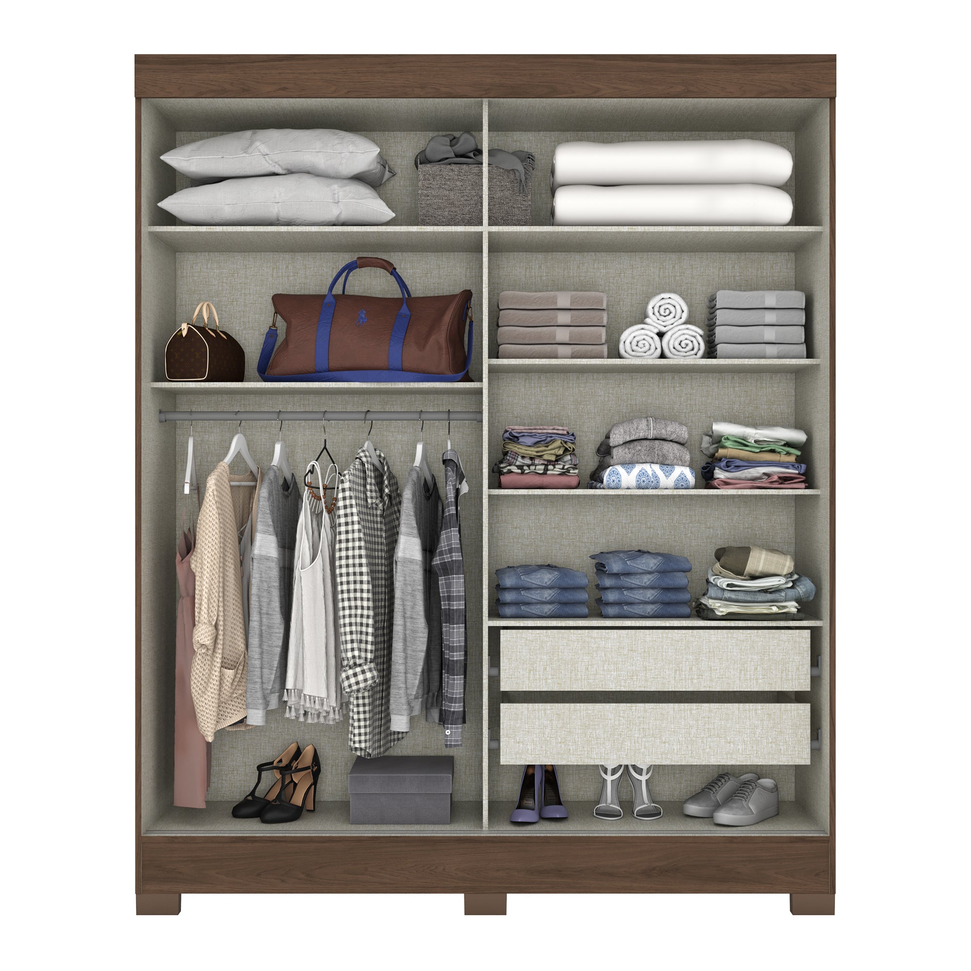 - Spacious compartments for hanging clothes and folded garments