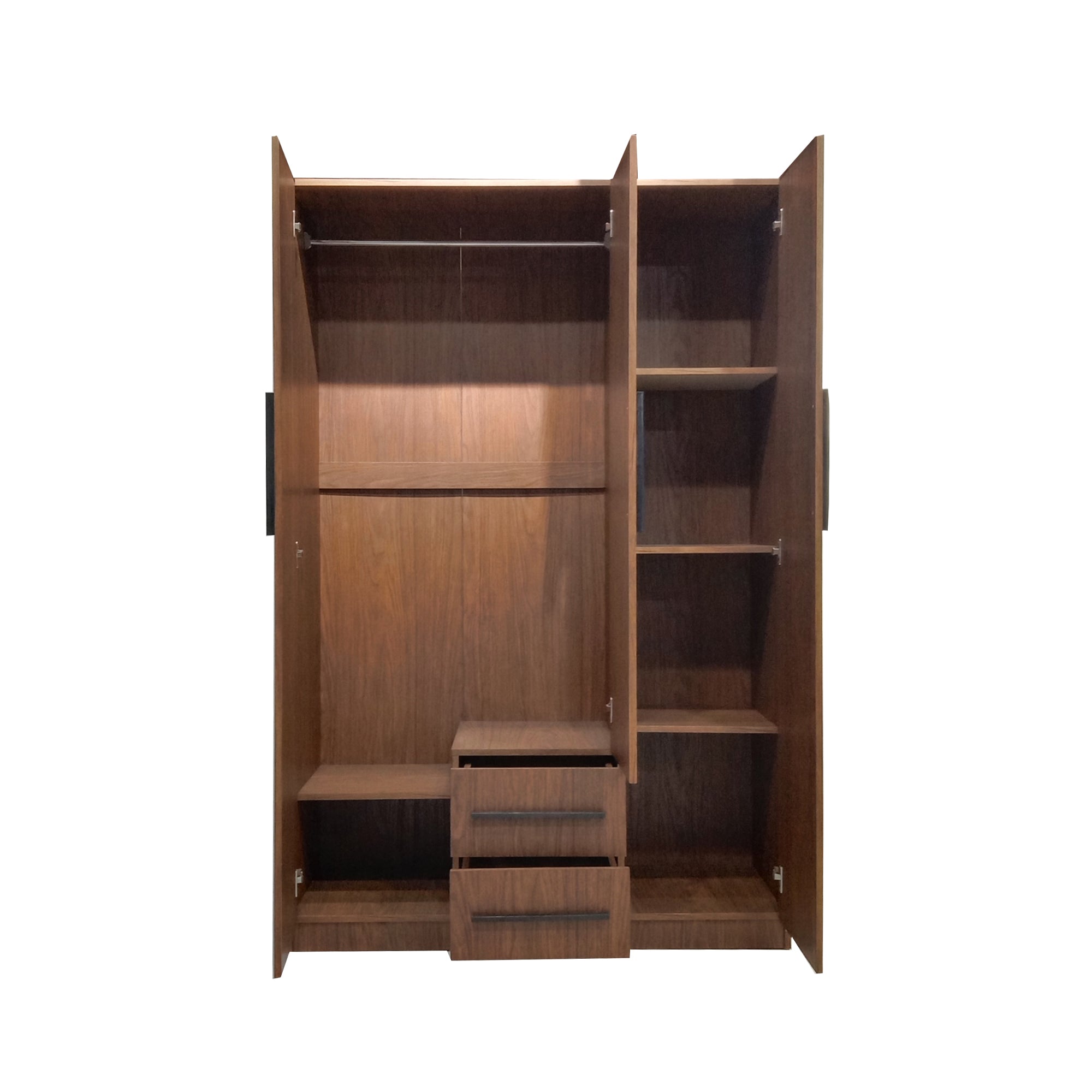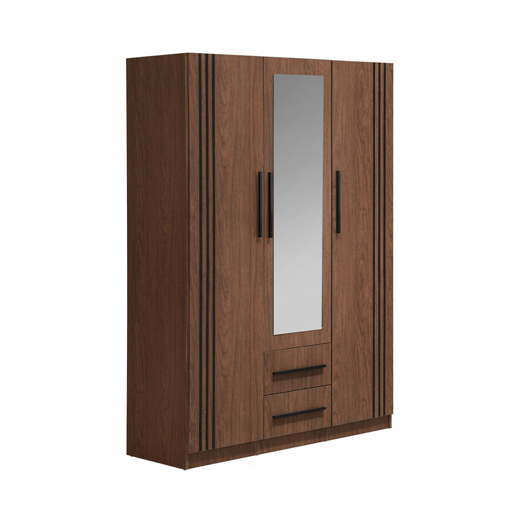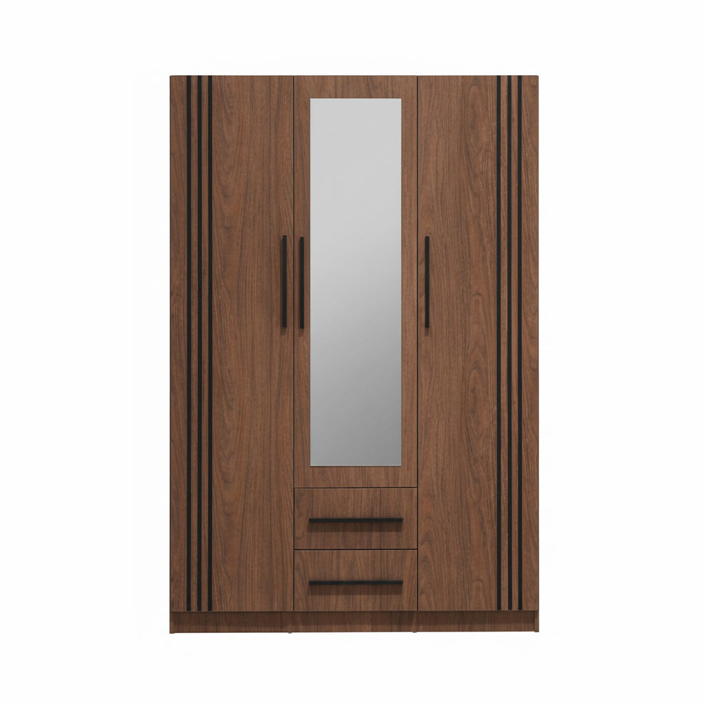 The Farah 3-Door Wardrobe is a practical and elegant storage solution designed to keep your space organized. It features a full-length mirror, multiple shelves, and drawers for convenient storage — perfect for modern bedrooms.