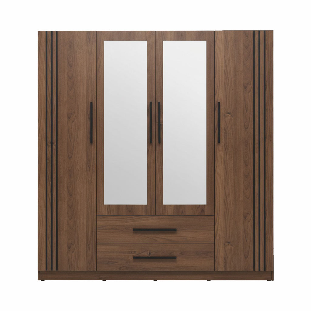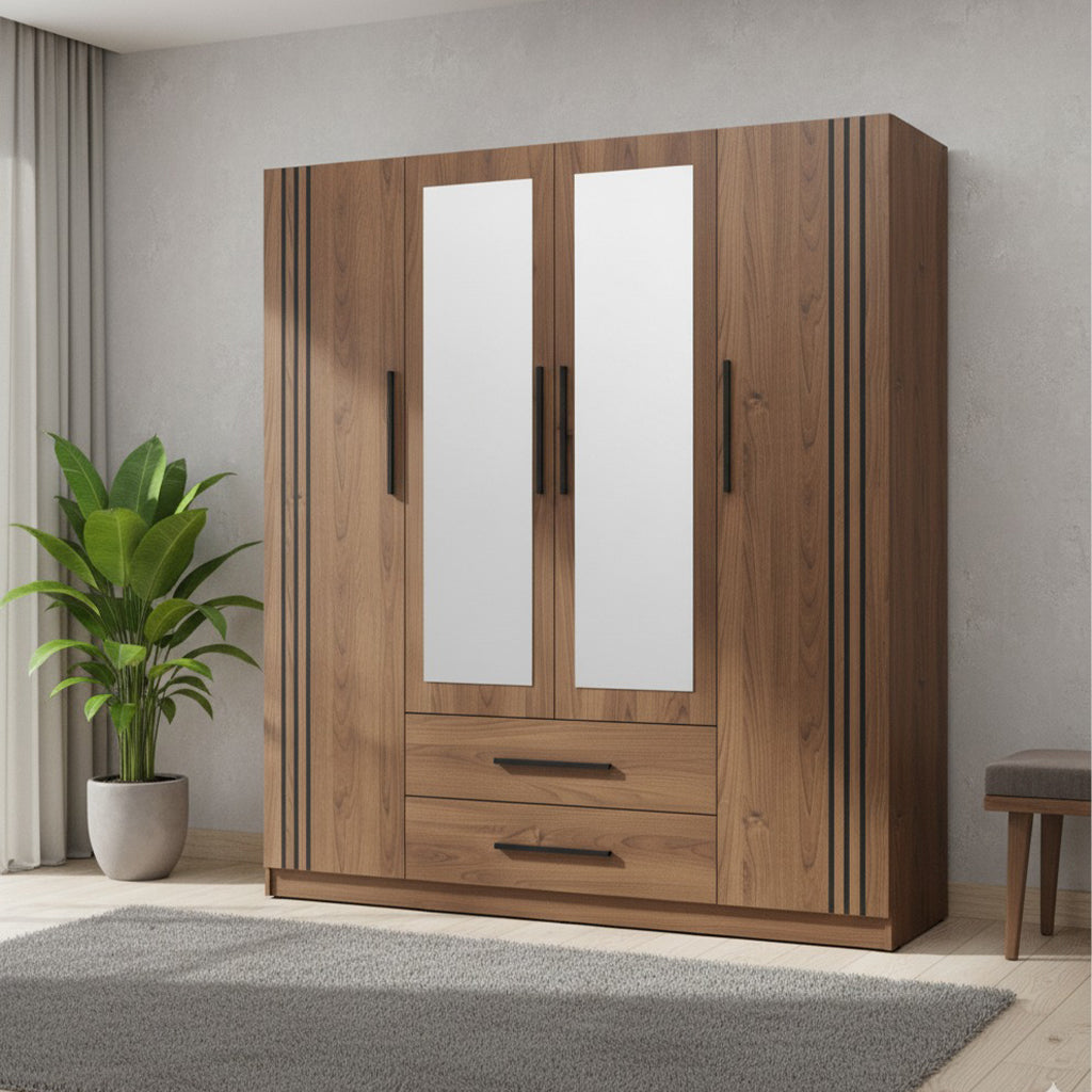 The Farah 4-Door Wardrobe combines timeless elegance with modern practicality. Its rich dark brown wood finish and dual mirrored doors make it both functional and stylish — ideal for spacious bedrooms that value refined organization and design.