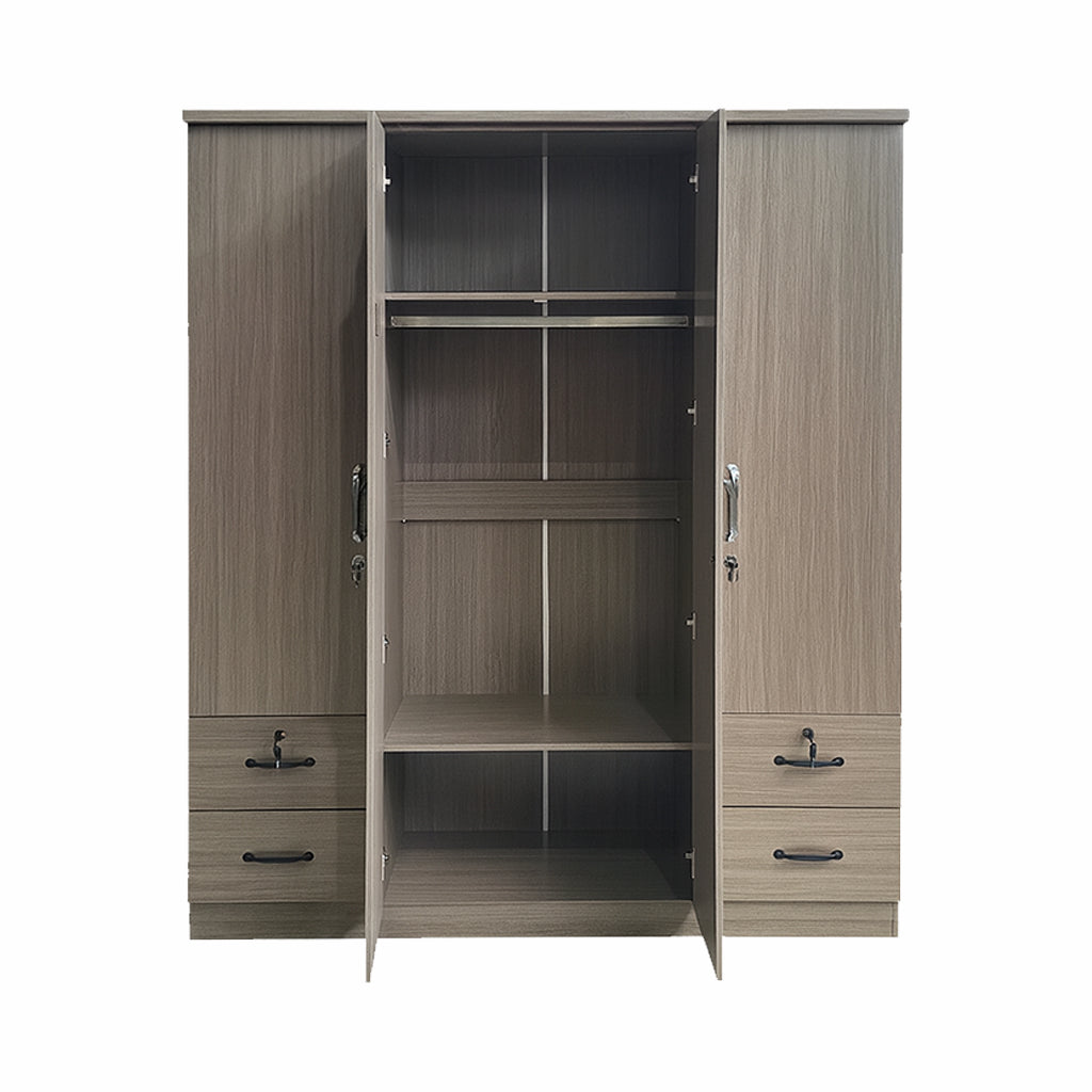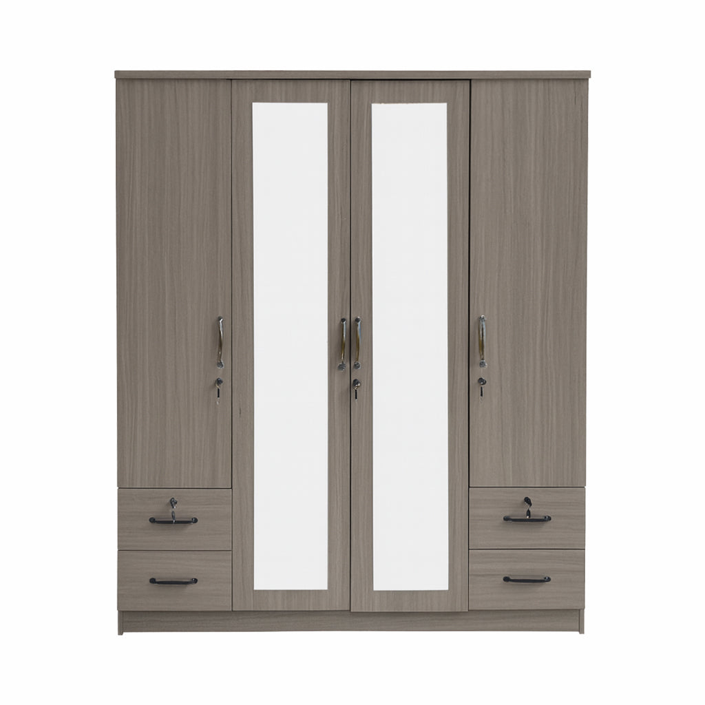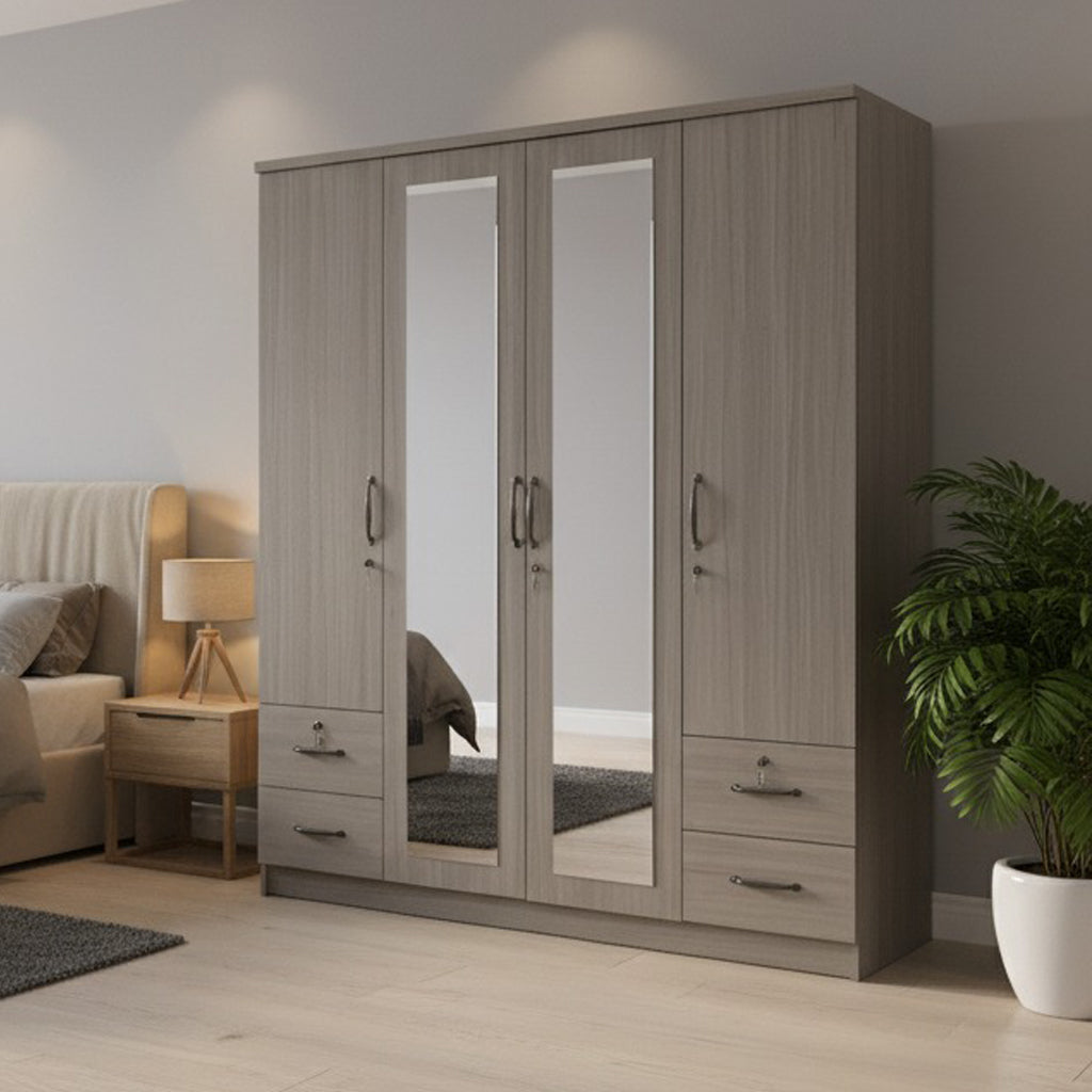The Jimin 4-Door Wardrobe combines modern style with everyday functionality. Featuring dual mirror panels and a light oak grey finish, it adds sophistication and spacious organization to your bedroom. Perfect for those who value both elegance and efficiency.