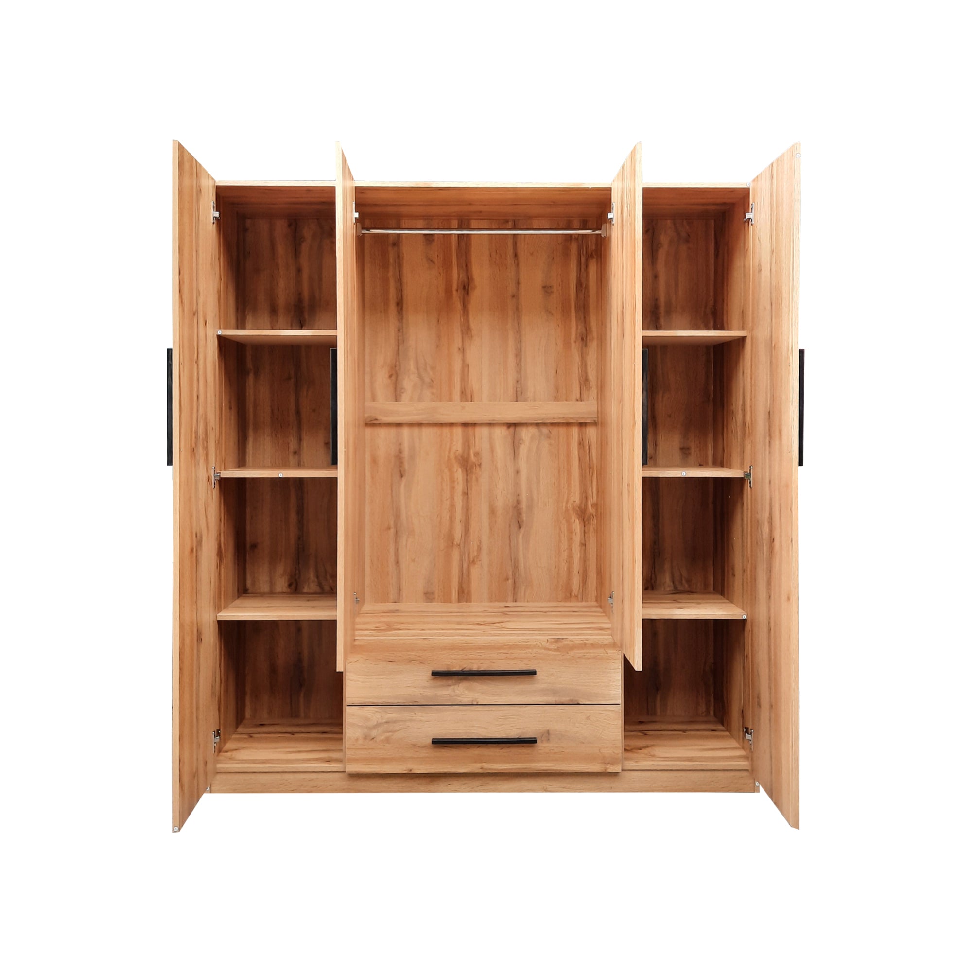 The Rica 4-Door Wardrobe blends modern design with practical storage. Its woton oak finish and twin mirrored doors bring warmth and brightness to any bedroom, while the spacious layout ensures everything stays organized in style.